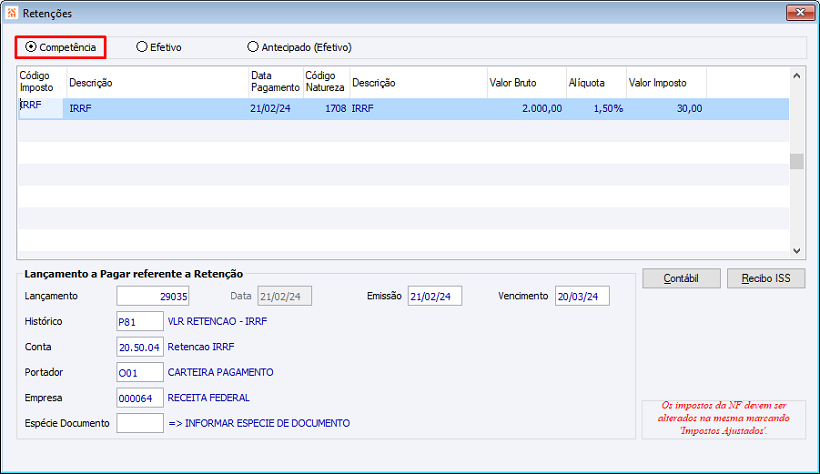 Controle de retenções em adiantamentos a fornecedores 0036