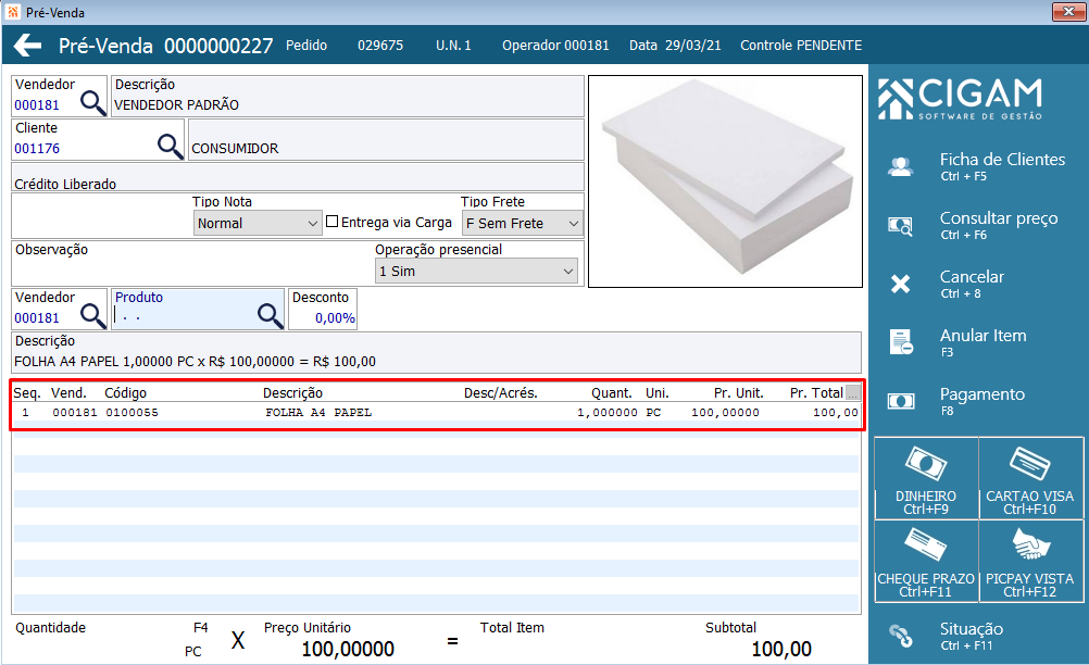 Cadastro Itens Pre Venda
