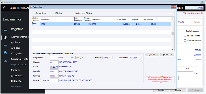 Controle de retenções em adiantamentos a fornecedores 0053