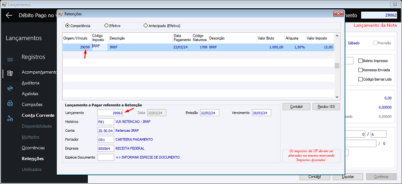 Controle de retenções em adiantamentos a fornecedores 0068