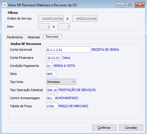 parametros para gerar NF de remessa de recursos da OS