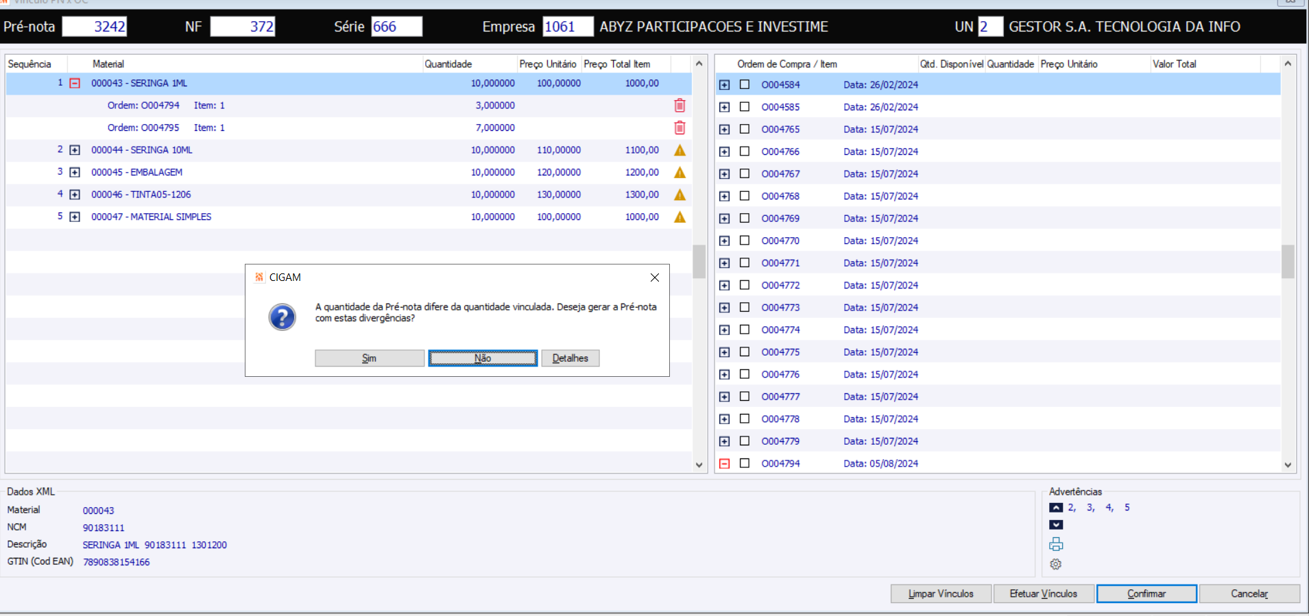 Arquivo:Importacao XML Itens sem Vínculo.png