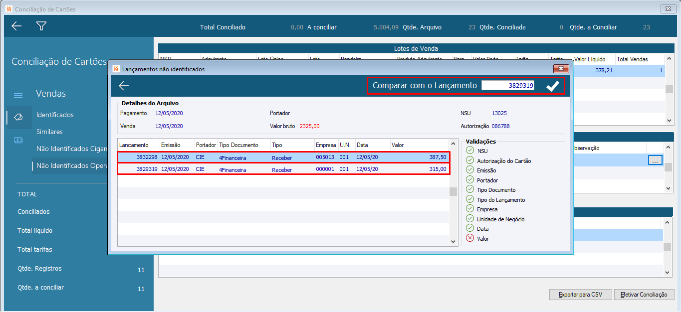Lançamento possível a ser vinculado