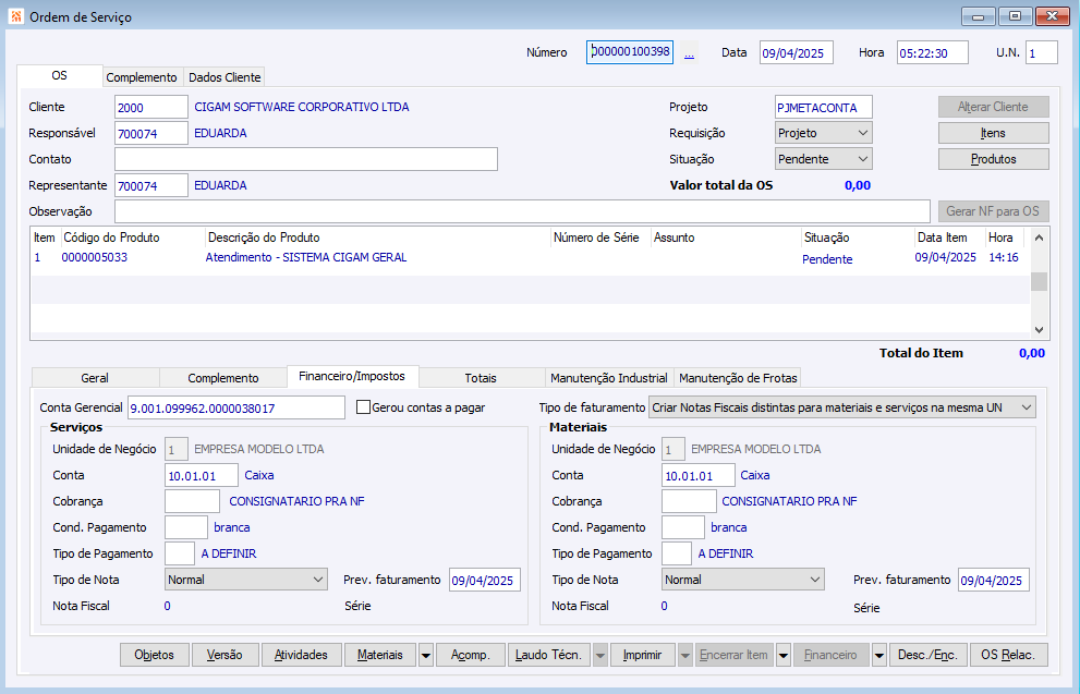 Metaconta na guia Financeiro/Impostos na OS