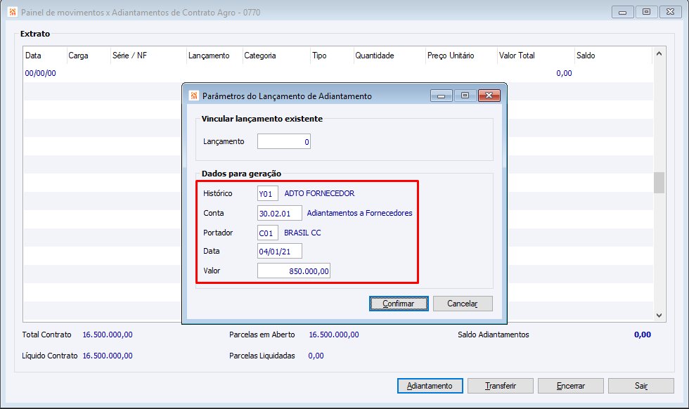 Parametros do Lancamento de Adiantamento