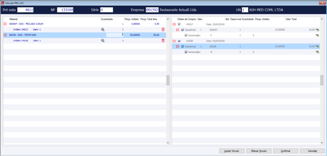 Vínculo efetuado através do ícone
