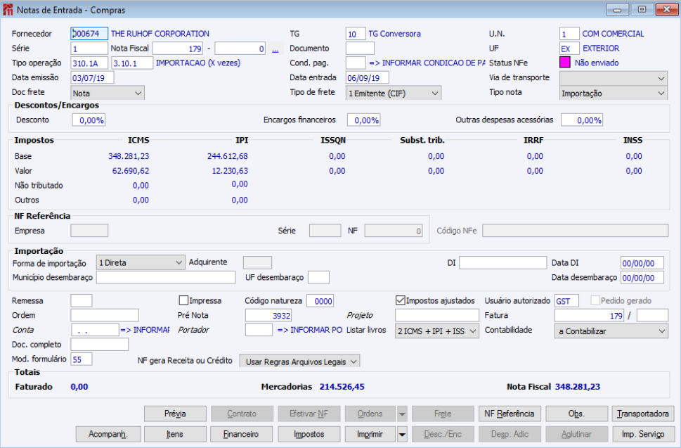 Nota de Entrada de Importação