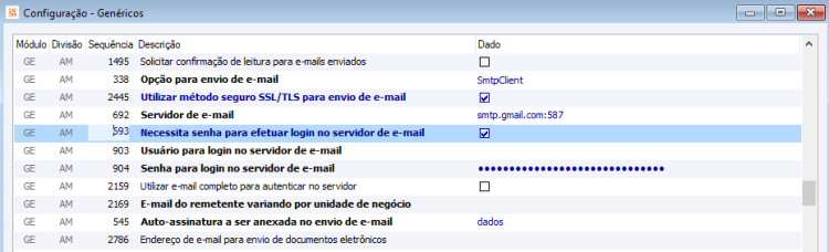 É essencial validar as configurações de e-mail através do menu Utilidades/Diversos > Genéricos > Parâmetros > Configurações. As configurações a serem verificadas são as seguintes: